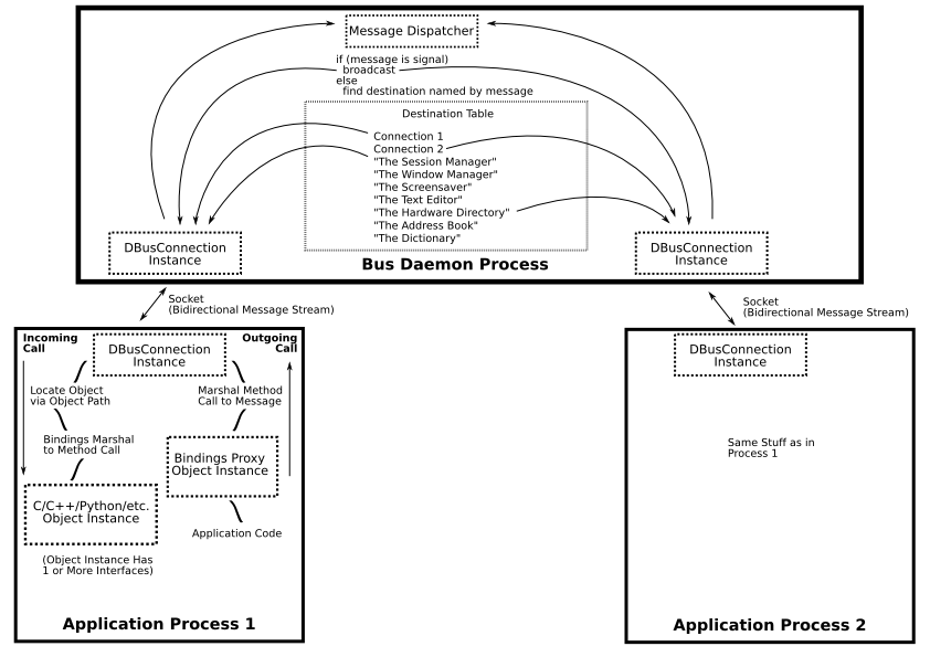 Подробно о D-Bus можно узнать здесь.Возможно позже сделаю ряд постов поглубже о этой технологии, а пока вставлю сюда общую схему работы :
